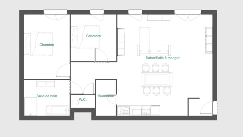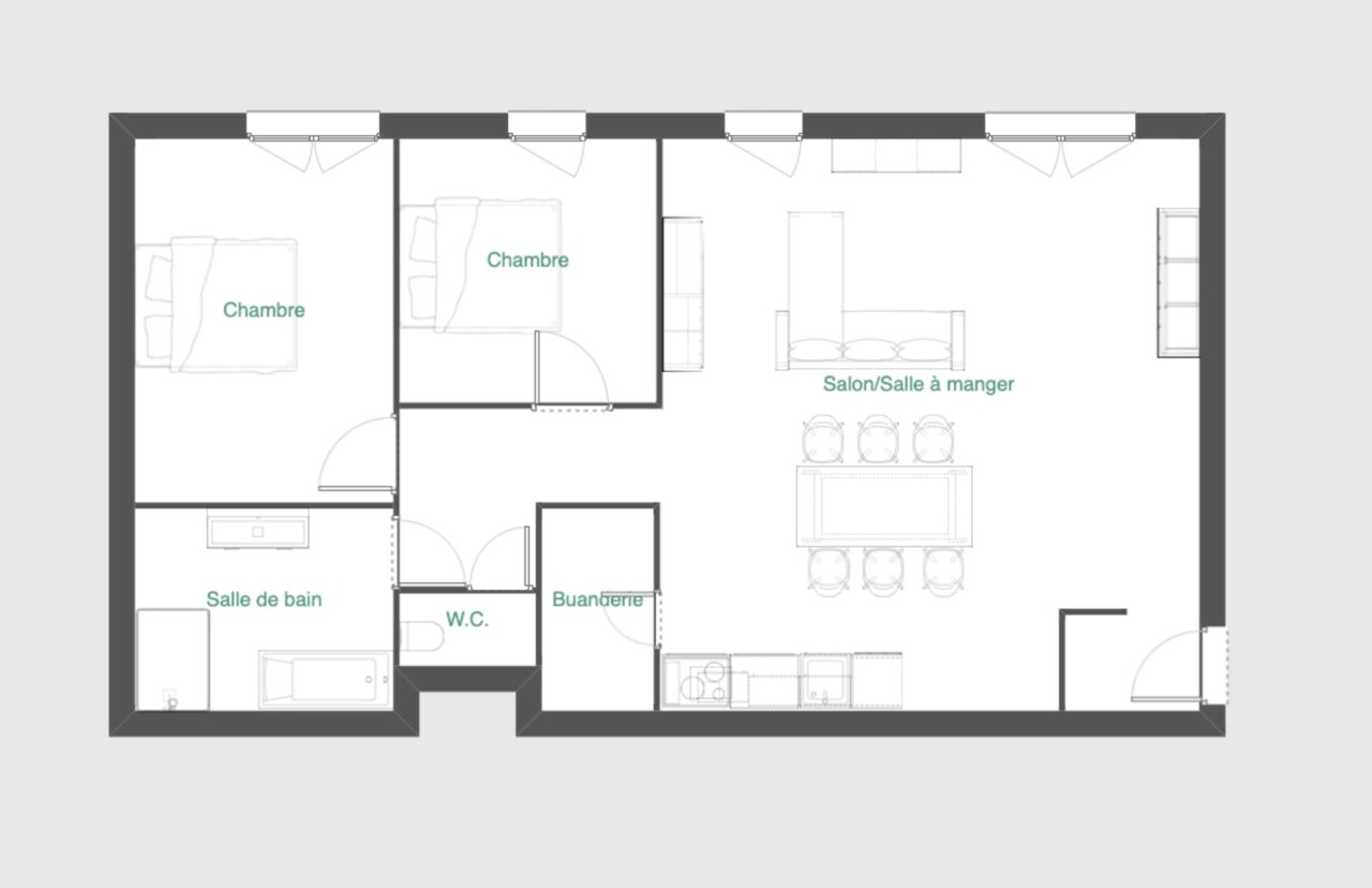 Il se compose d'un grand séjour avec cuisine ouverte et accès au balcon, deux chambres, une salle de bains (bain, douche italienne, double vasque) avec WC séparé et d'une buanderie. Possibilité de disposer de deux emplacements de parking.