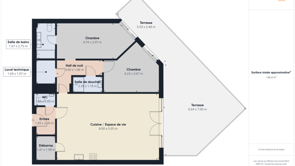 Idéalement situé à Braine-l’Alleud, dans un quartier prisé et à proximité immédiate de la gare ainsi que des commodités, IVA vous propose ce superbe appartement au sein du projet résidentiel de standing "les Terrasses des rats" . Implanté dans une nouvelle copropriété à taille humaine composée de 18 logements, ce bien offre un cadre de vie confortable et une excellente accessibilité. L’appartement se compose d’un hall d’entrée avec wc séparé, d’un séjour lumineux d’environ 43 m² intégrant une cuisine ouverte entièrement équipée, avec accès direct à une très grande terrasse privative de 53 m². Le hall de nuit dessert deux chambres de 14 et 15 m², une salle de bains avec WC, une salle de douche ainsi qu’un local technique. Le bien bénéficie d’équipements techniques performants répondant aux normes énergétiques actuelles, avec un chauffage au sol par pompe à chaleur, une production d’eau chaude via ballon thermodynamique, une ventilation double flux et des finitions soignées. L’appartement présente d’excellentes performances énergétiques avec un PEB A+. L’installation de panneaux solaires liés au bien est obligatoire pour un montant de 2.600 euros. Des emplacements de parking couverts et sécurisés peuvent être acquis en supplément au prix de 26.000 euros par emplacement. *** Prix demandé: 399.400€ *** Une TVA réduite à 6% est possible sous conditions. Il s’agit de la dernière opportunité disponible au sein de ce projet très recherché. Pour une visite, contactez nous.