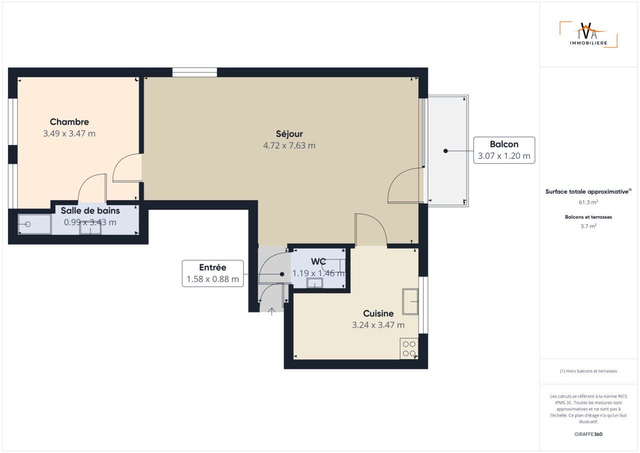 L'appartement est composé d'une entrée, d'un séjour lumineux de 36 m², d'une cuisine de 15 m², d'une salle de douche, d'un WC séparé et d'une chambre de 12 m².