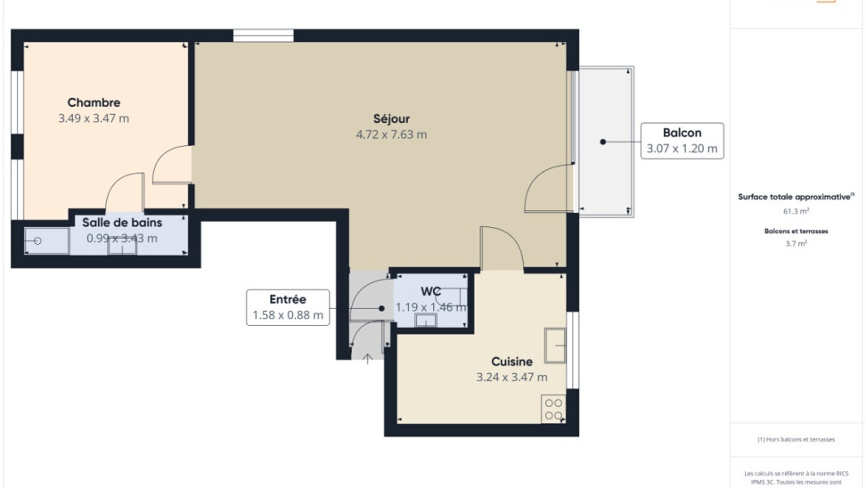 L'appartement est composé d'une entrée, d'un séjour lumineux de 36 m², d'une cuisine de 15 m², d'une salle de bains, d'un WC séparé et d'une chambre de 12 m².