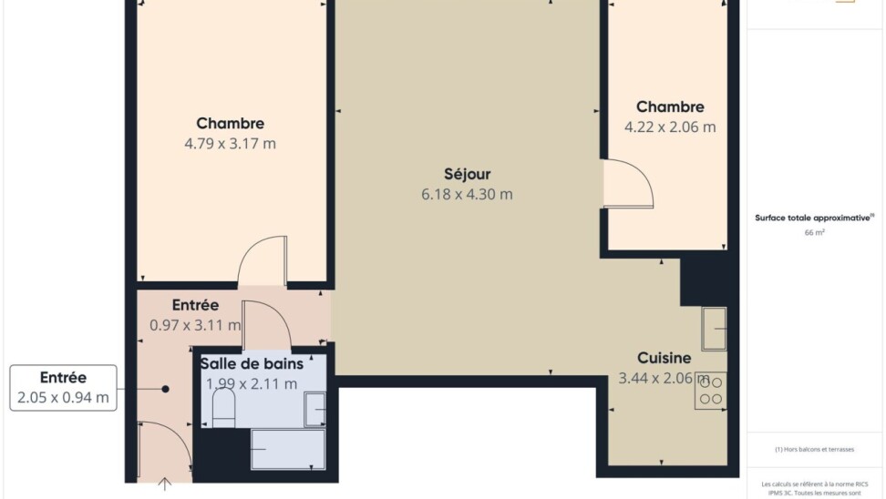 Il se compose d'une entrée, d'un agréable séjour de 26,50 m² avec balcon de 3m², d'une cuisine ouverte équipé, de deux chambres (15,20 et 8,70 m² ) et d'une salle-de-bains avec WC.