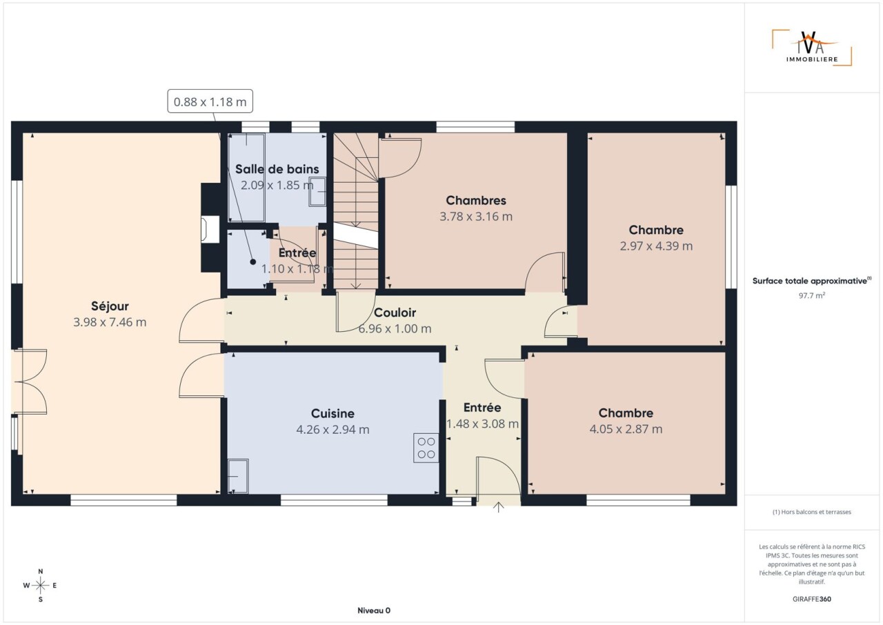 D'une superficie totale de +/- 100 m² habitables (260m² bâti), on y trouve un hall d'entrée, une cuisine, un séjour lumineux avec feu ouvert donnant accès à la terrasse avec pergola, un WC, une salle de douche, 3 chambres (12, 12 et 13m²).