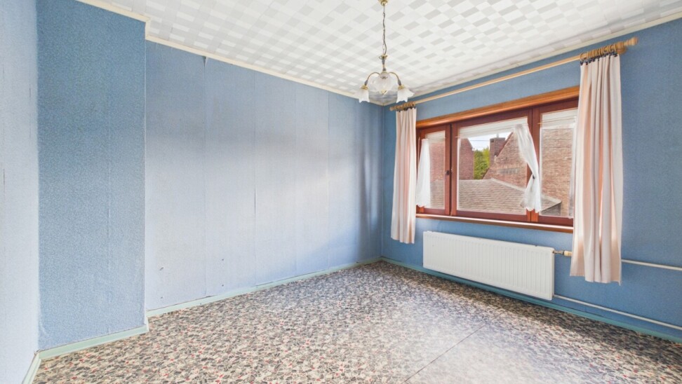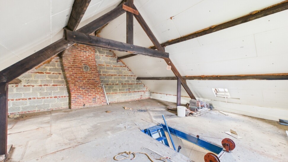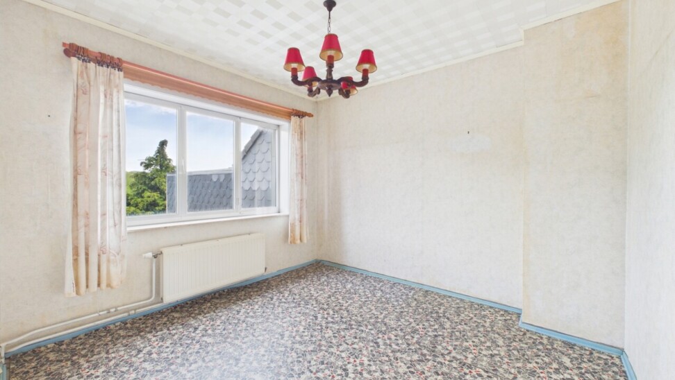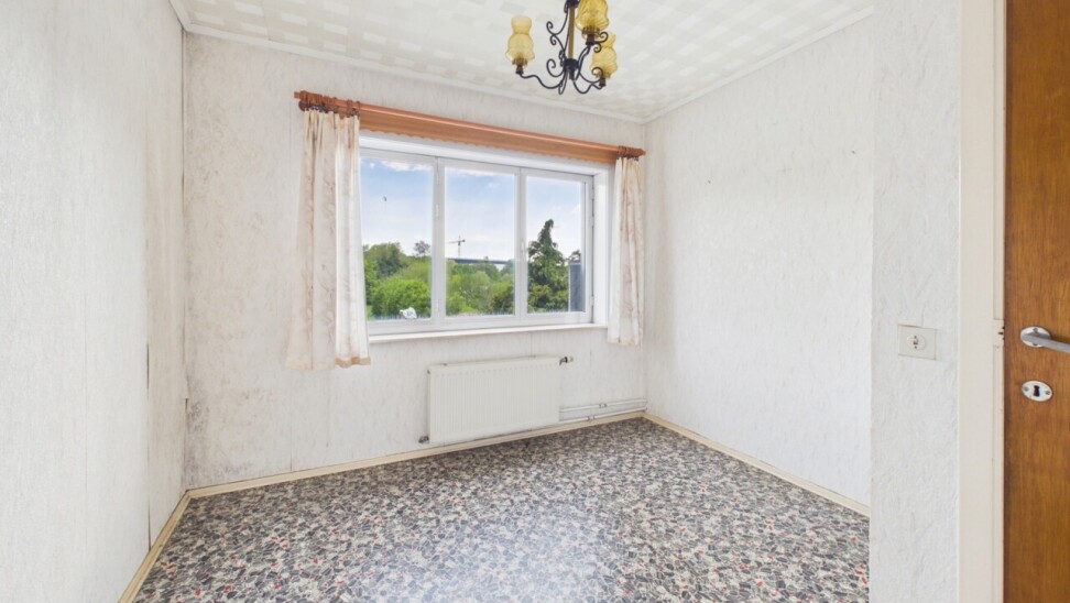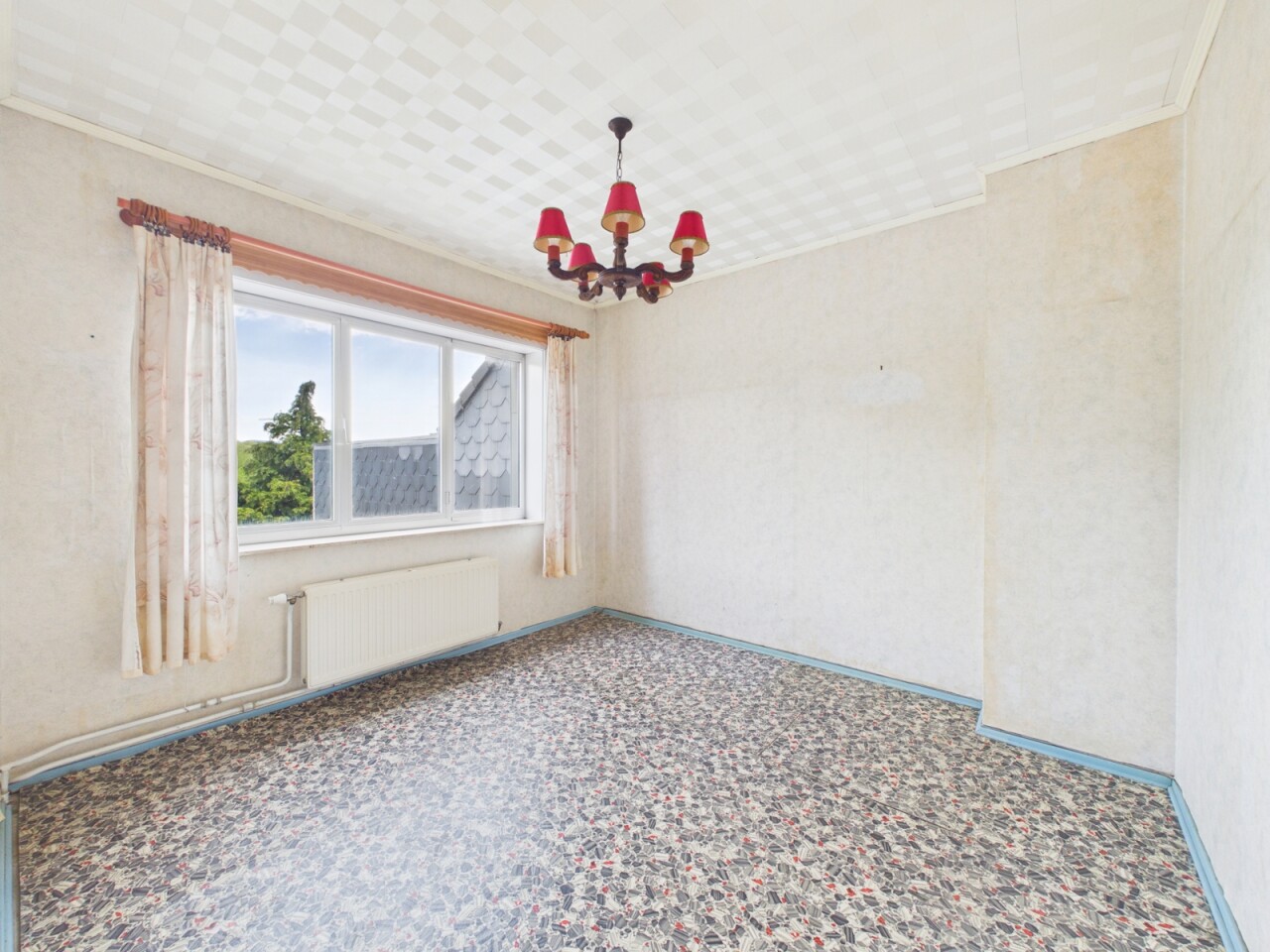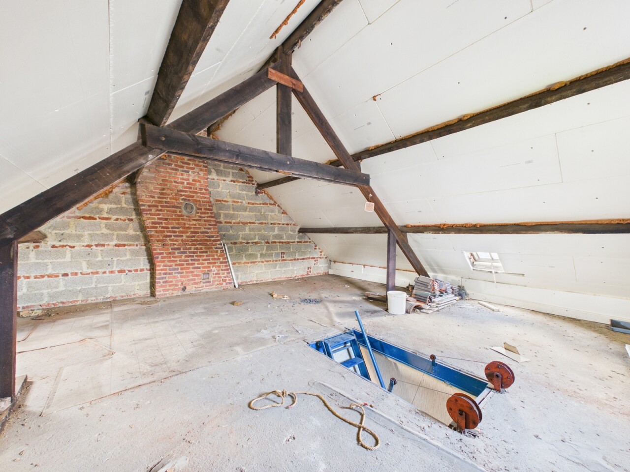 À l’étage, vous trouverez trois chambres (±9,5 m², 11 m² et 13 m²) ainsi qu’une salle de bains avec WC. Le grenier, actuellement accessible par une trappe, offre un beau potentiel d’aménagement permettant la création d’une à deux chambres supplémentaires moyennant l’installation d’un escalier.