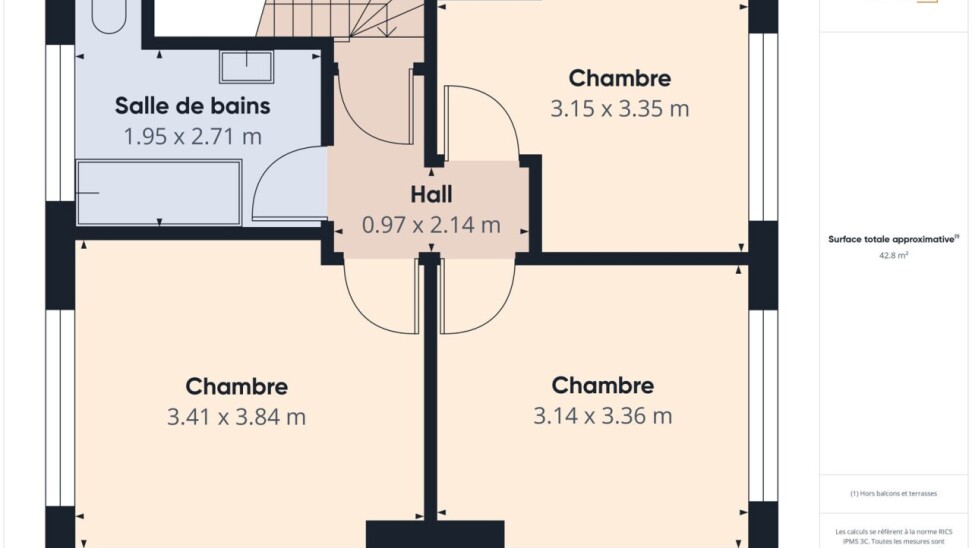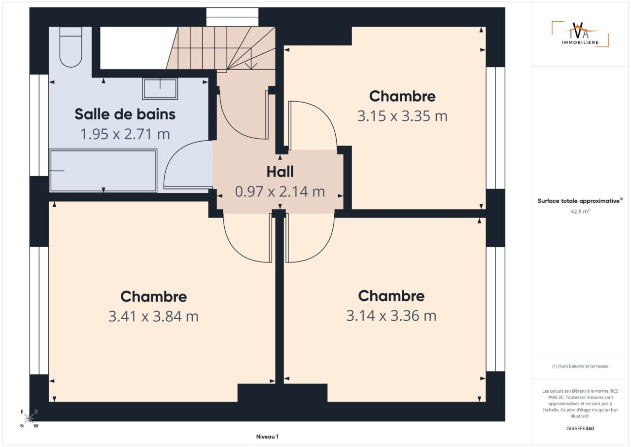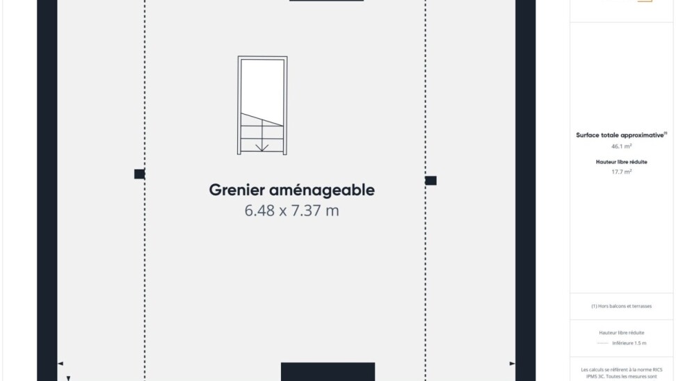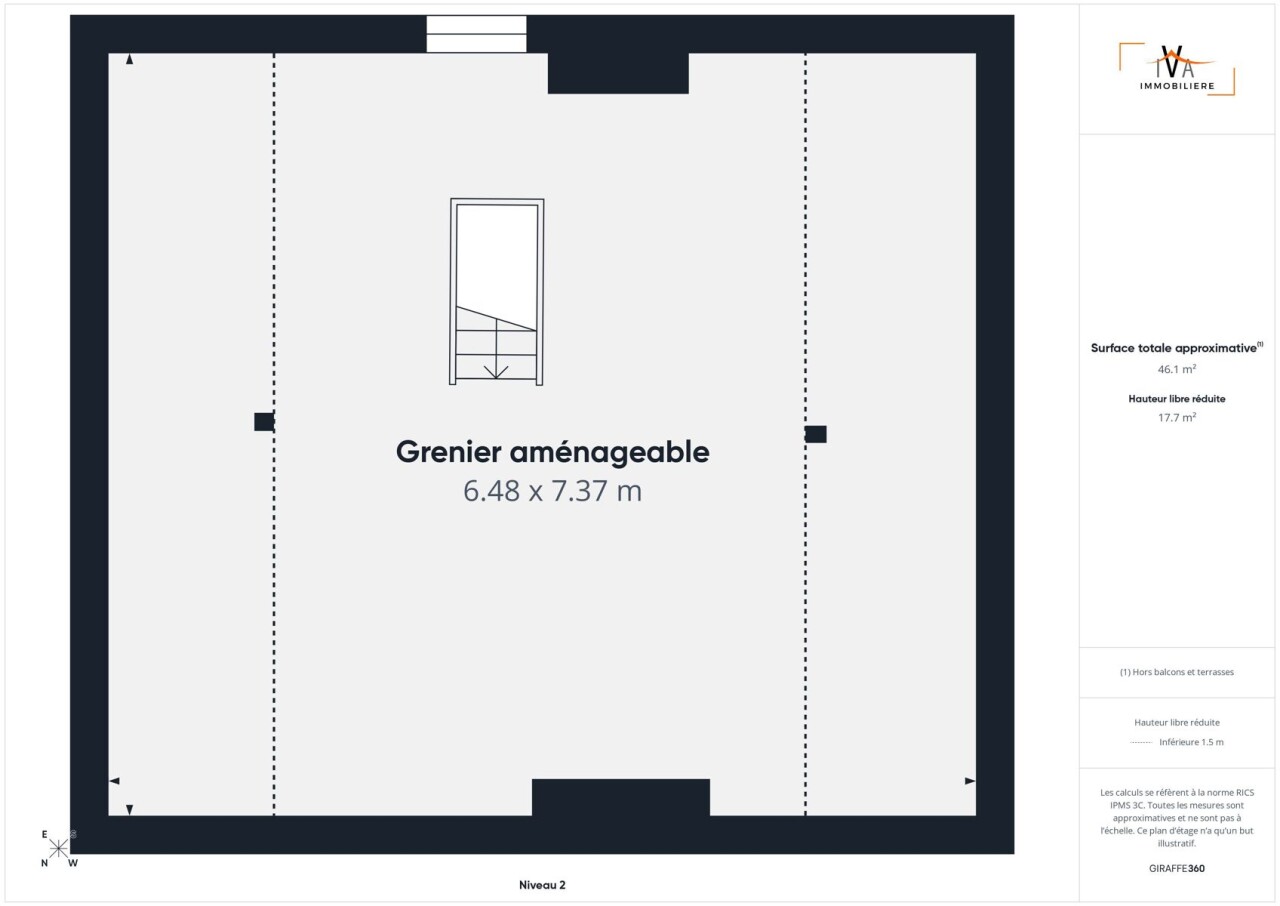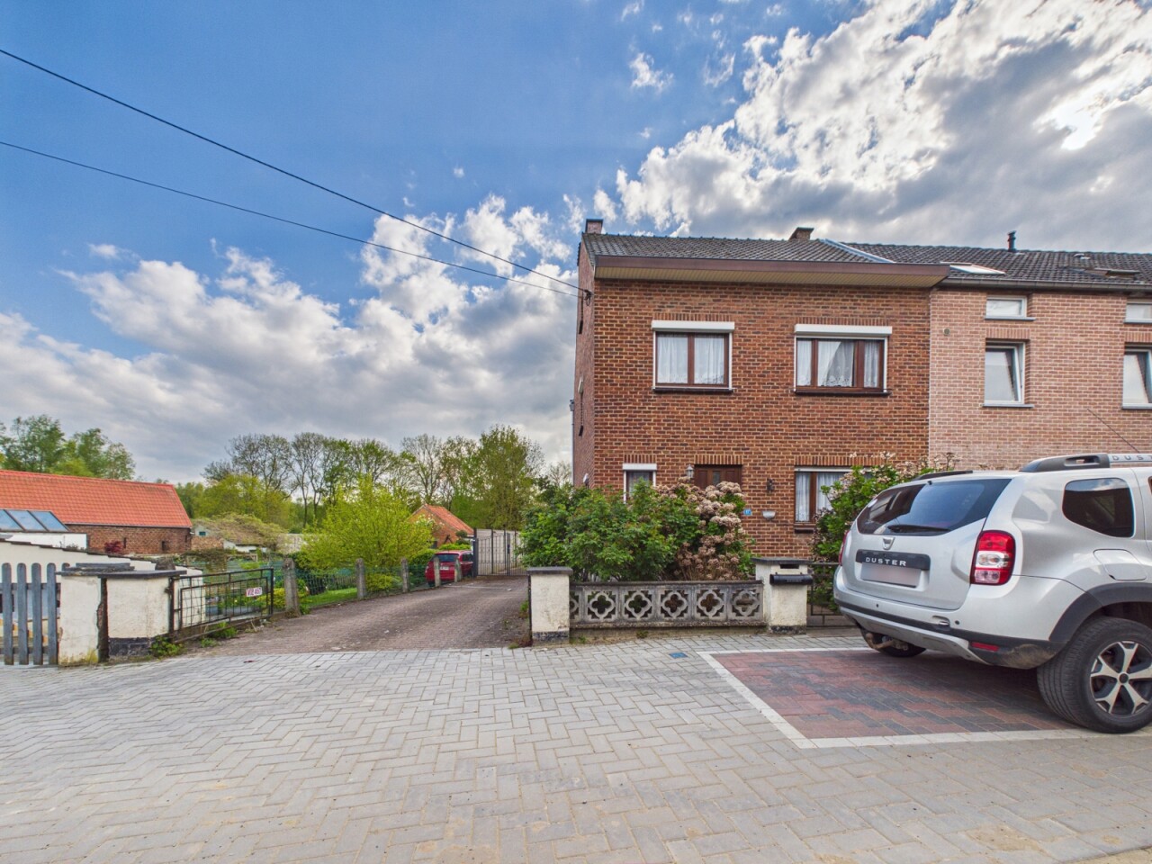 À l’étage, vous trouverez trois chambres (±9,5 m², 11 m² et 13 m²) ainsi qu’une salle de bains avec WC. Le grenier, actuellement accessible par une trappe, offre un beau potentiel d’aménagement permettant la création d’une à deux chambres supplémentaires moyennant l’installation d’un escalier.