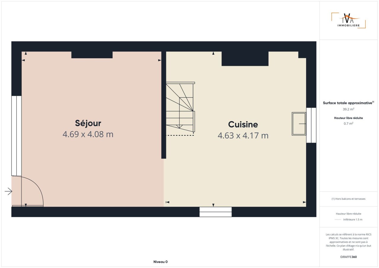 Elle se compose au rez de chaussée d'un séjour et d'une cuisine. Au premier étage, 2 chambres (11m² et 19,5m²) et une salle de douches avec wc.