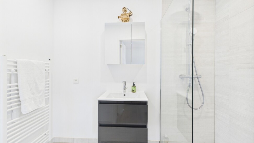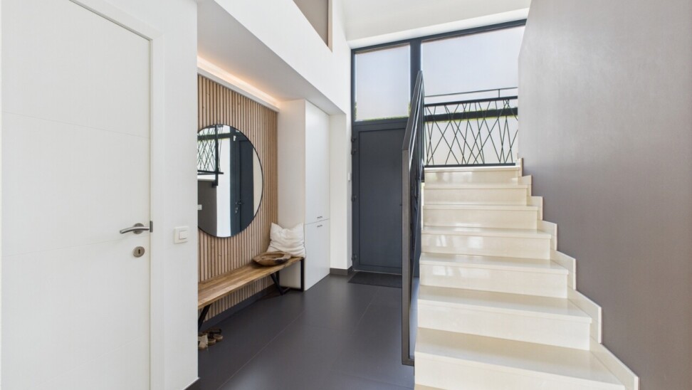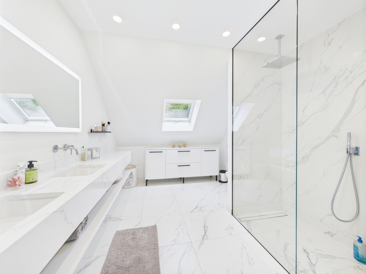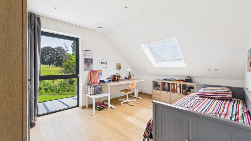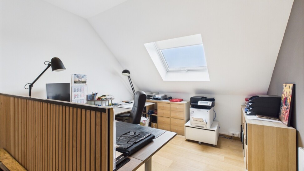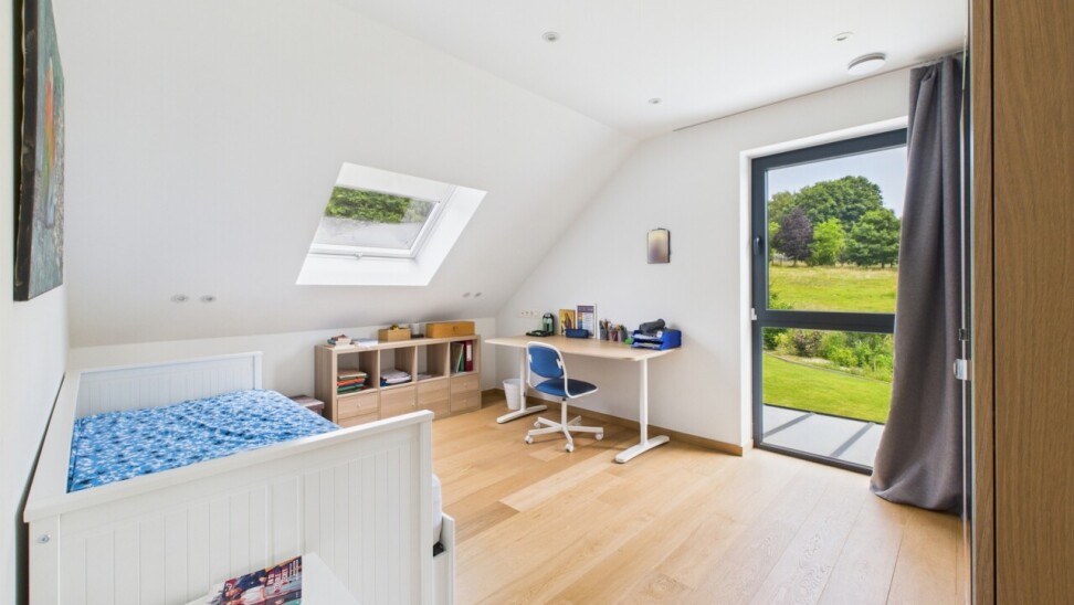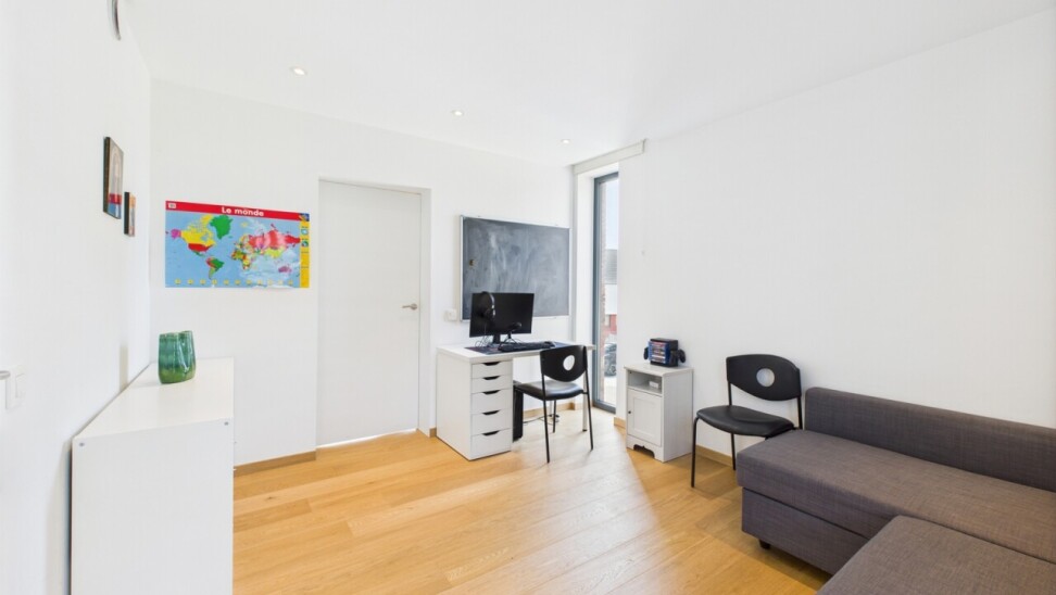 À l’étage : un espace polyvalent de 21 m², parfait pour un bureau ou une salle de jeux, deux chambres de 16 m², une salle de douche contemporaine et une suite principale dotée d’un dressing sur mesure et d’une salle d’eau habillée de marbre.