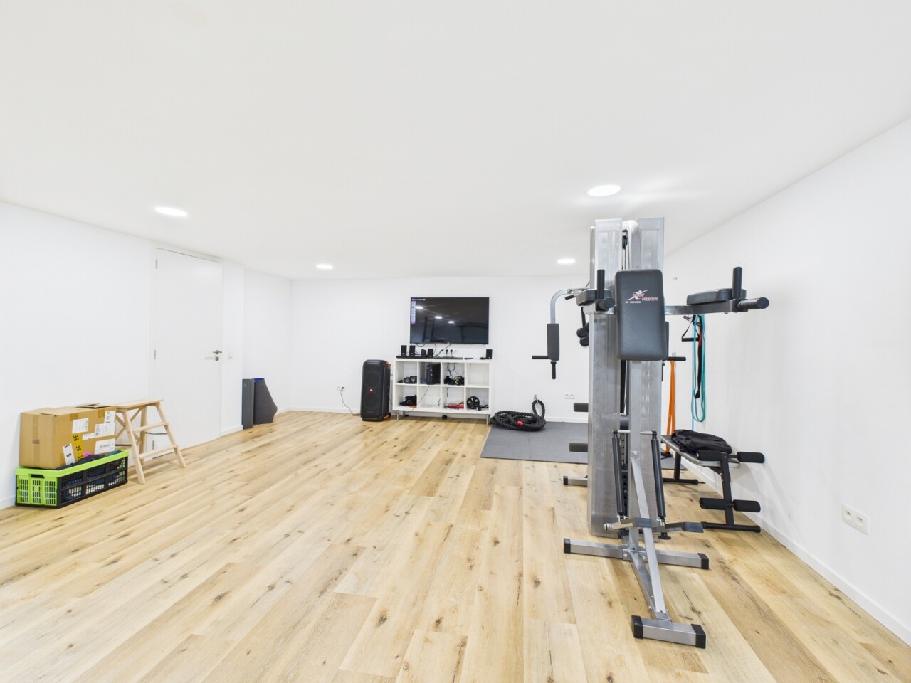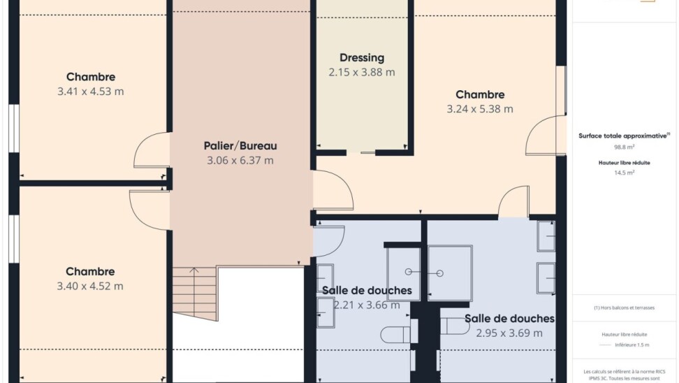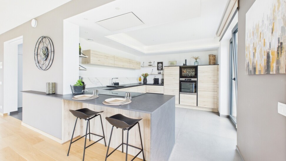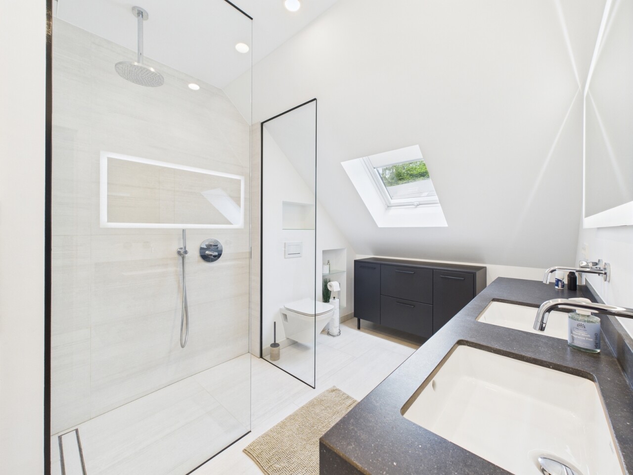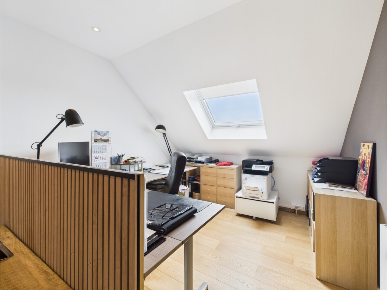 À l’étage : un espace polyvalent de 21 m², parfait pour un bureau ou une salle de jeux, deux chambres de 16 m², une salle de douche contemporaine et une suite principale dotée d’un dressing sur mesure et d’une salle d’eau habillée de marbre.