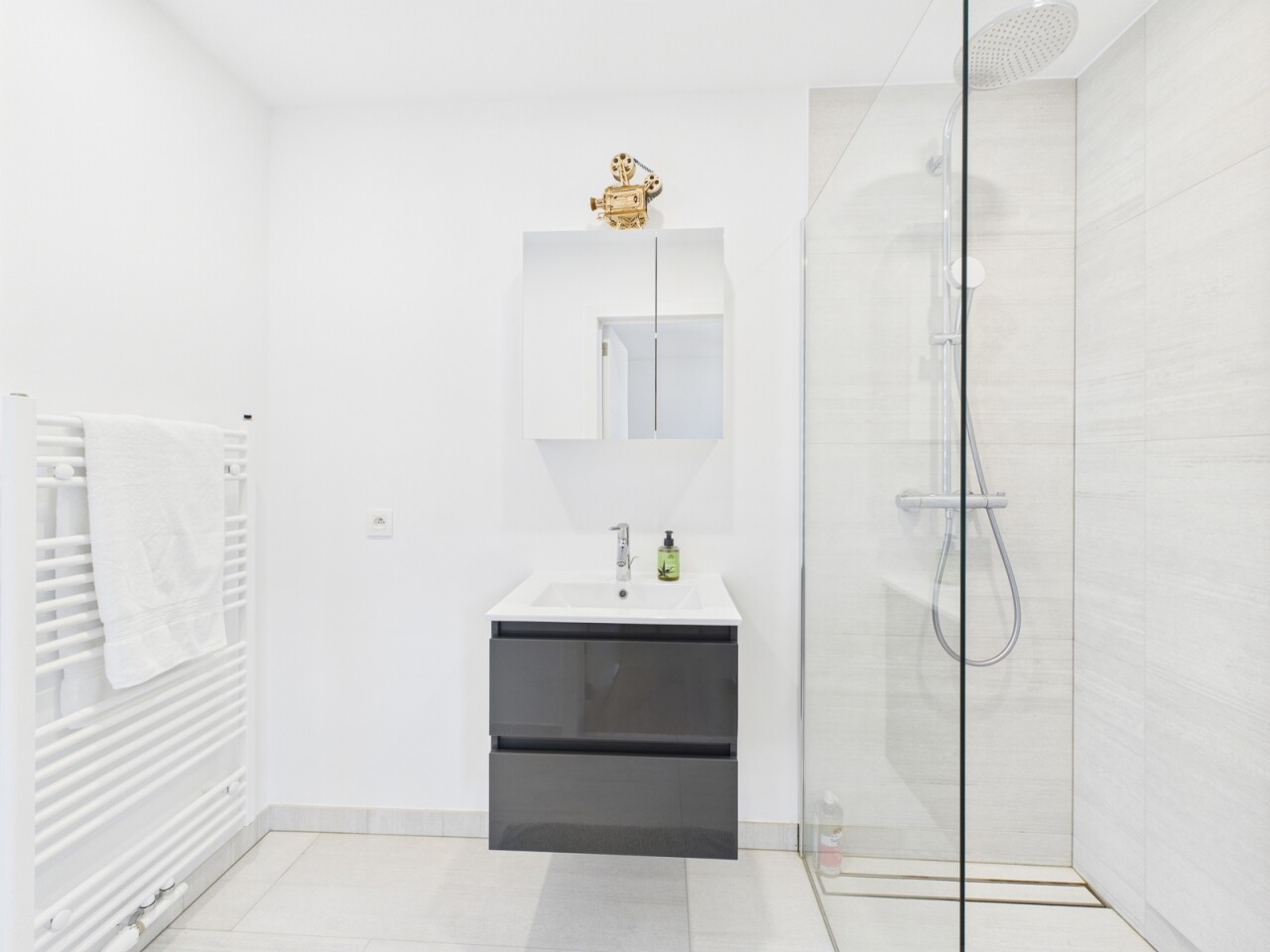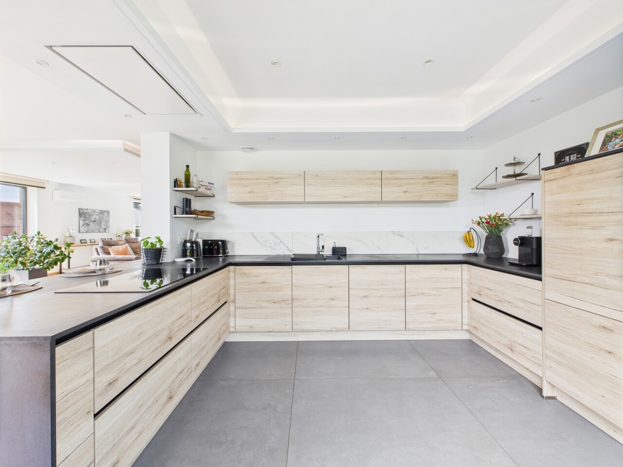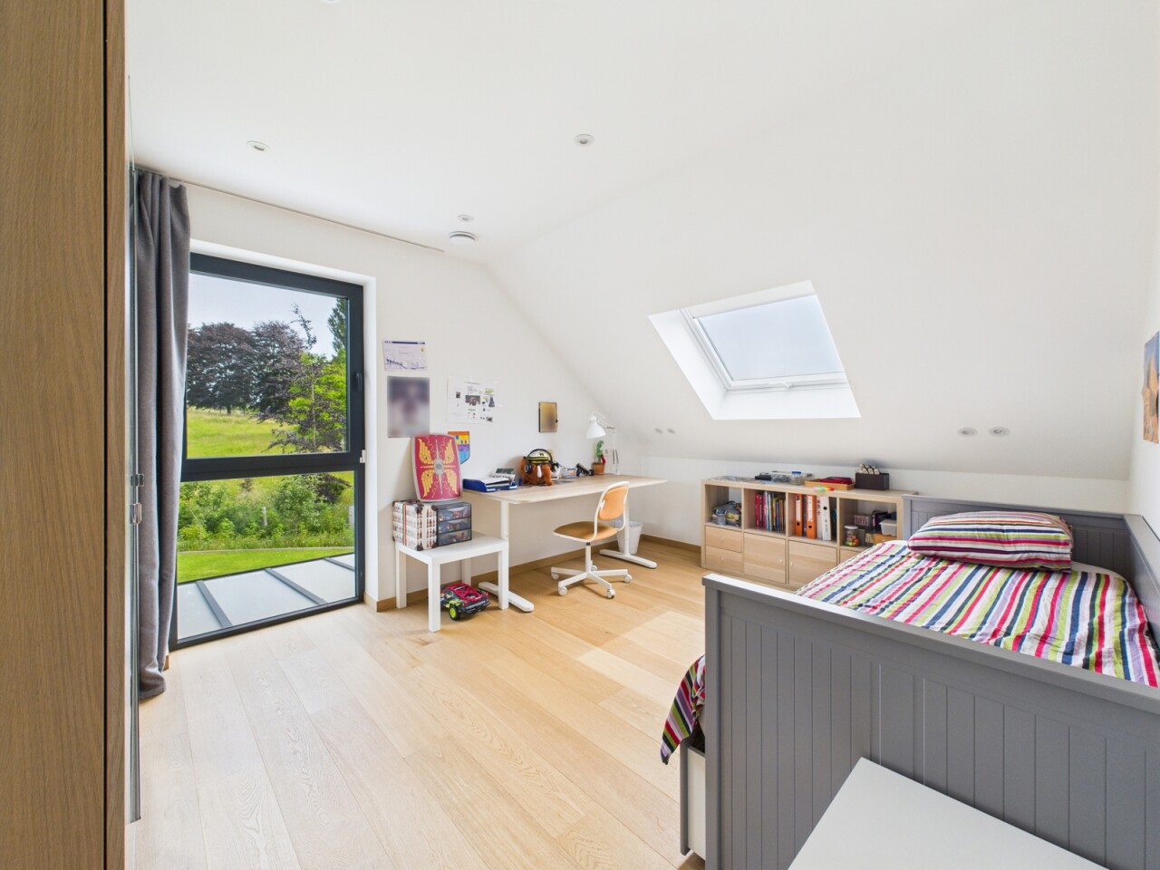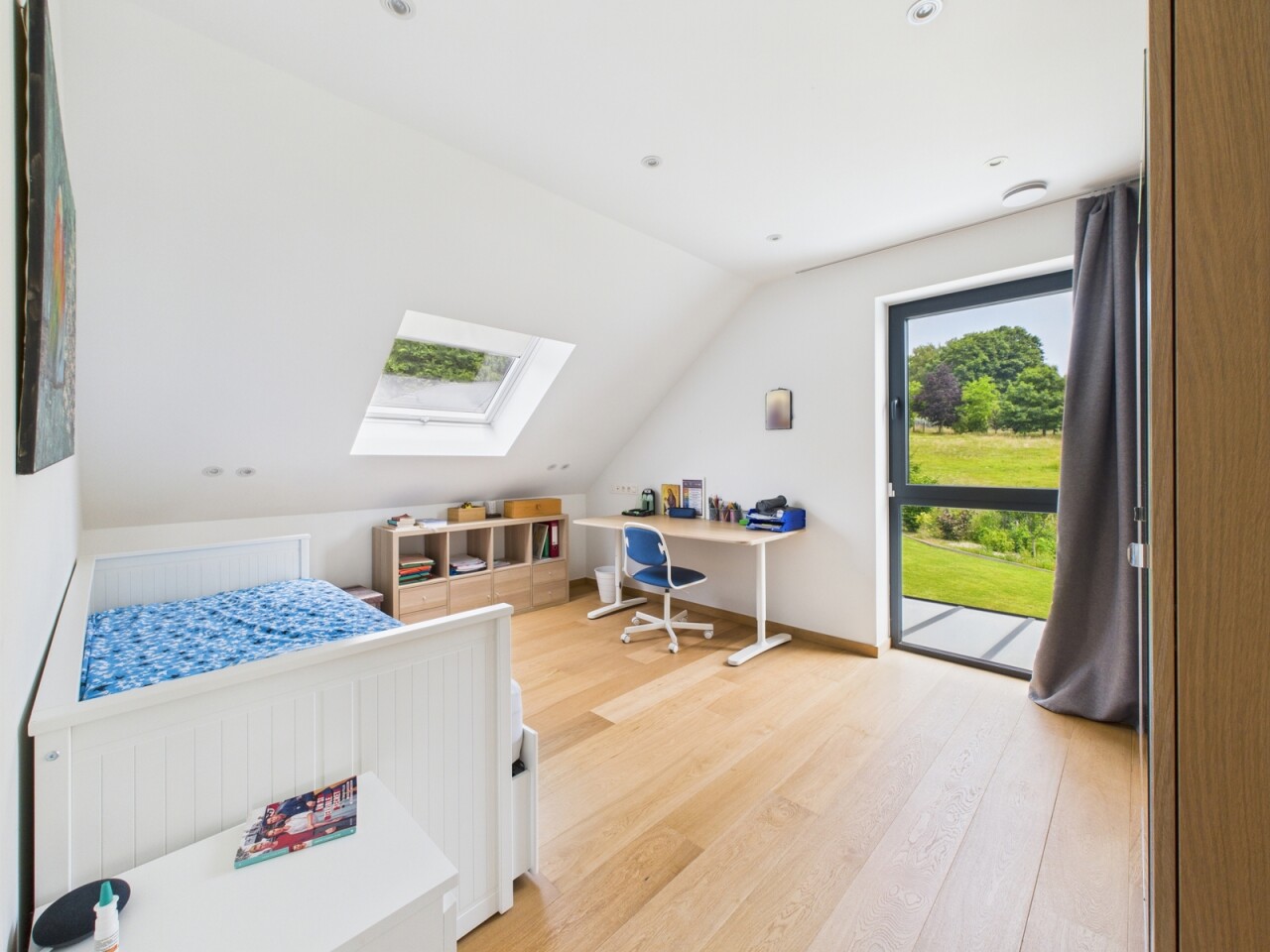 À l’étage : un espace polyvalent de 21 m², parfait pour un bureau ou une salle de jeux, deux chambres de 16 m², une salle de douche contemporaine et une suite principale dotée d’un dressing sur mesure et d’une salle d’eau habillée de marbre.