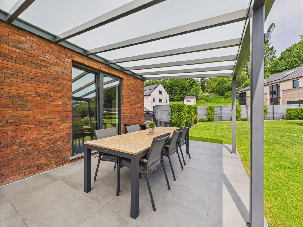 L’extérieur est soigneusement aménagé avec une belle terrasse, une pergola, un barbecue OFYR un abri de jardin et deux emplacements de parking.