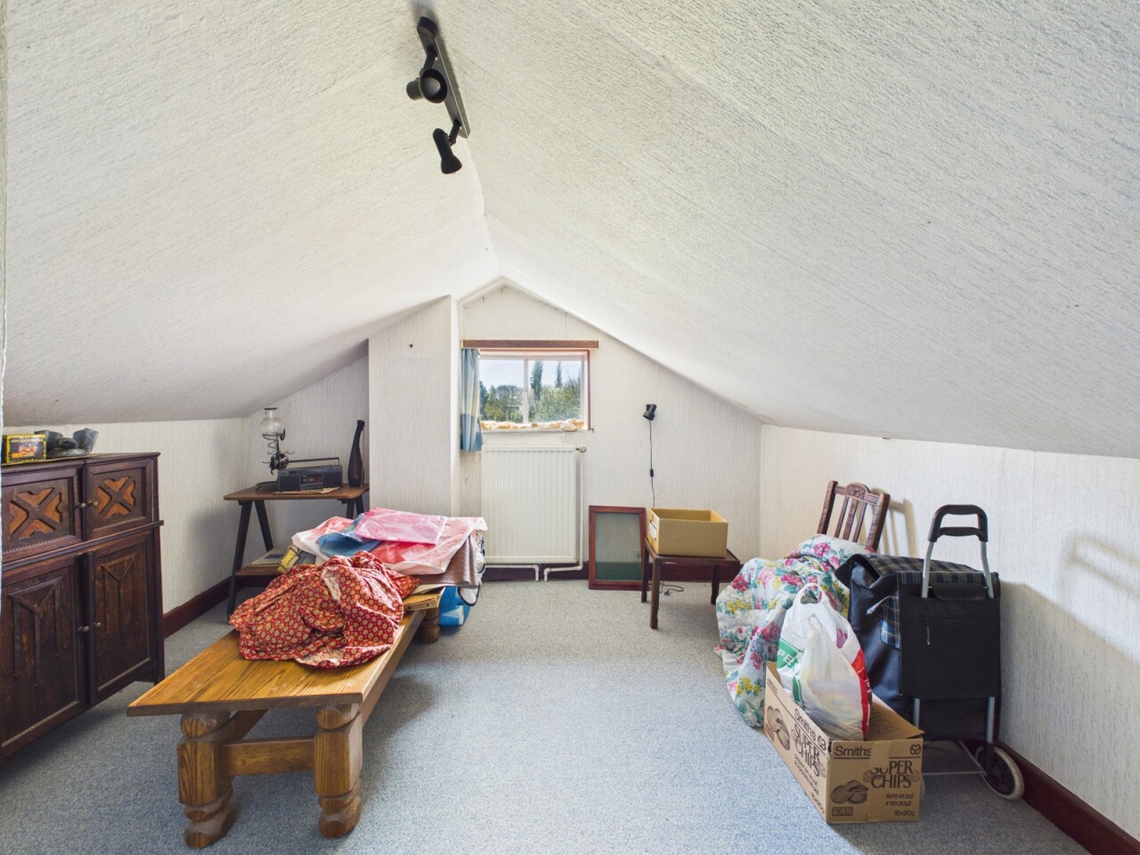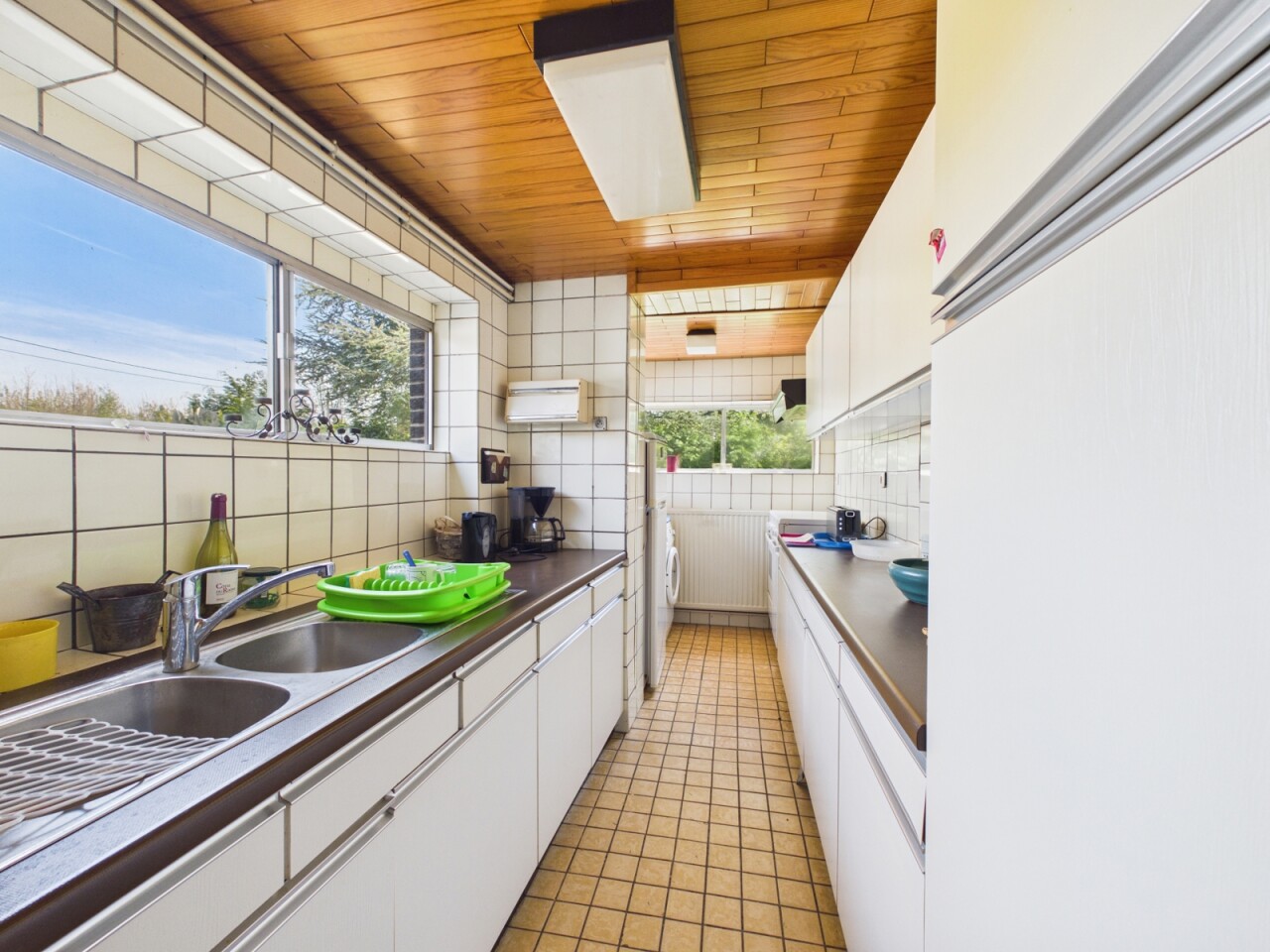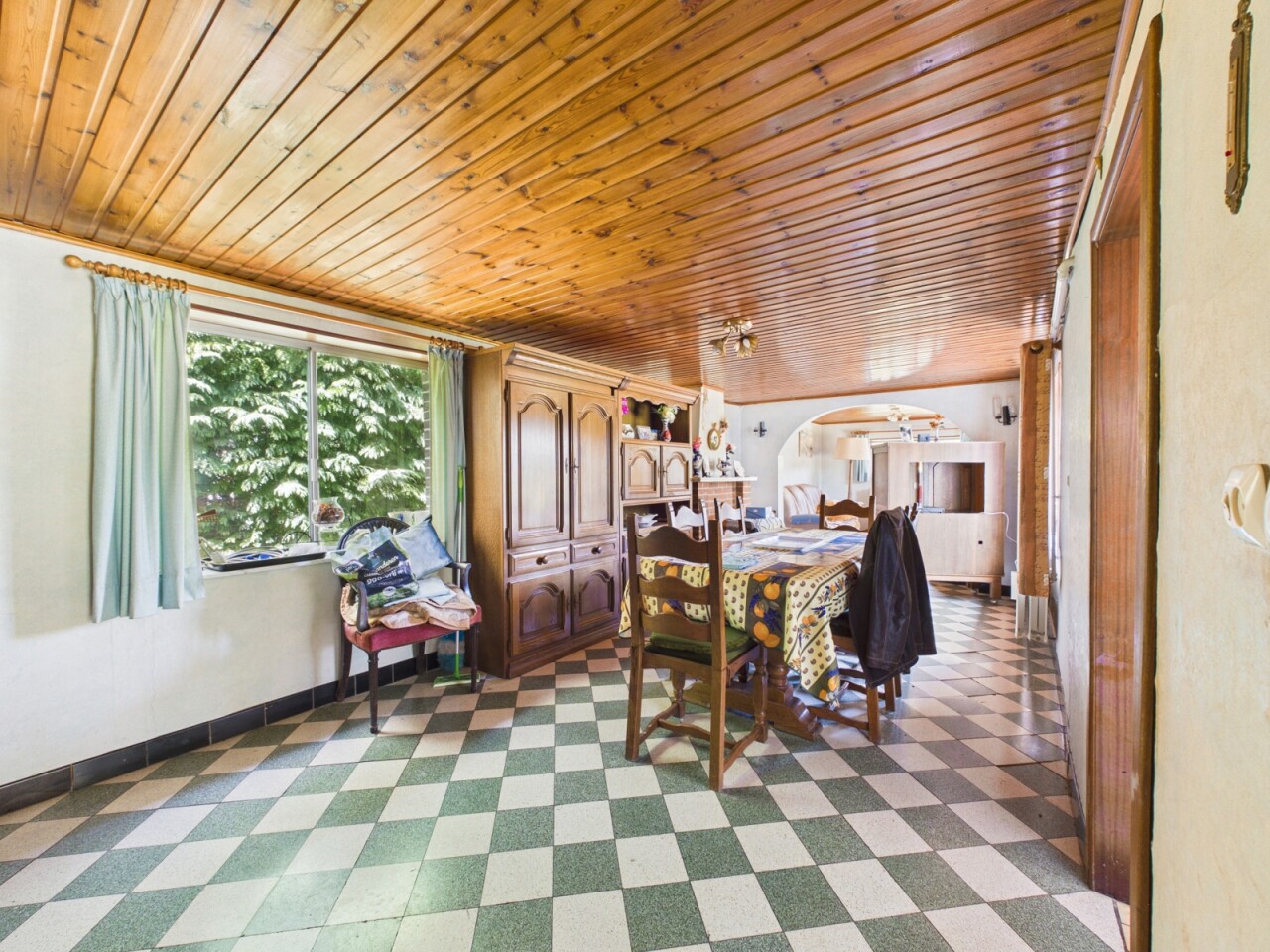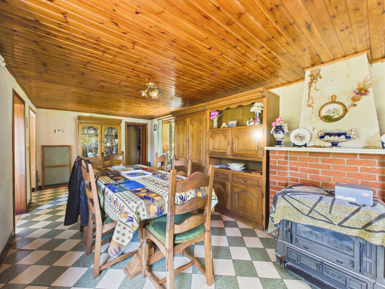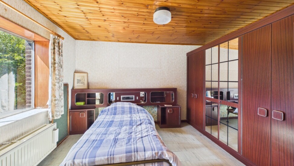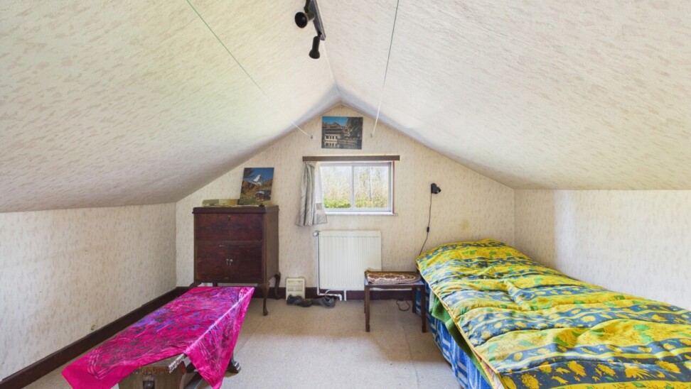 La maison se compose actuellement d’un hall d’entrée, d’un séjour, d’une cuisine, d’un bureau avec une chambre en enfilade ainsi que d’une salle de bains avec WC. À l’étage, vous trouverez deux chambres supplémentaires.