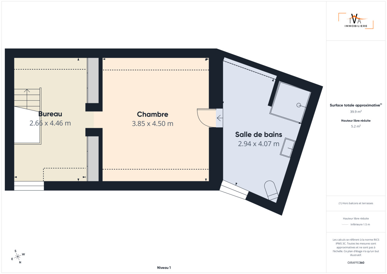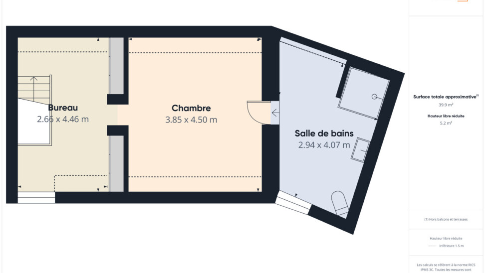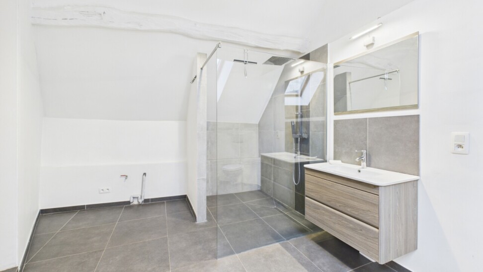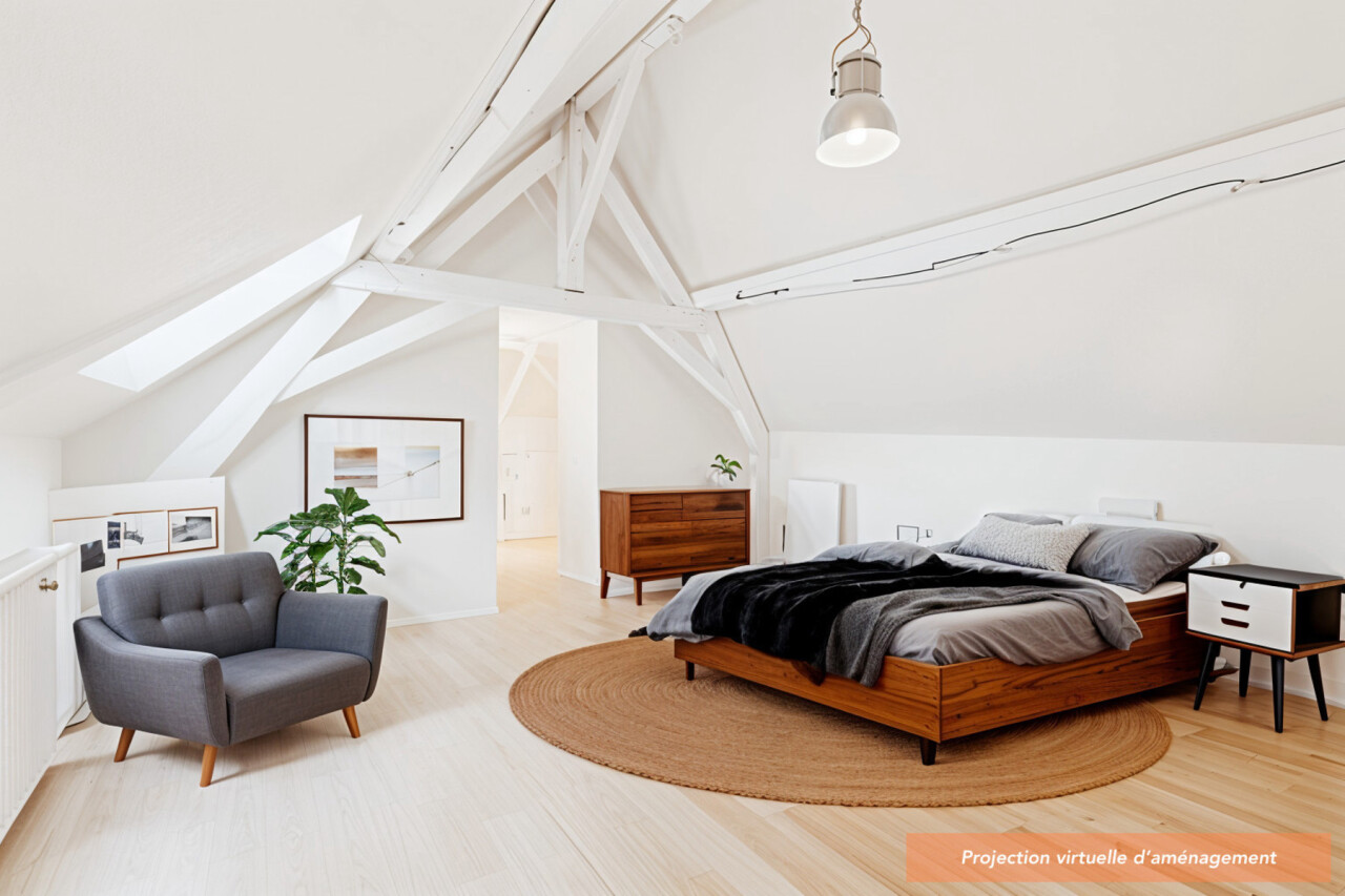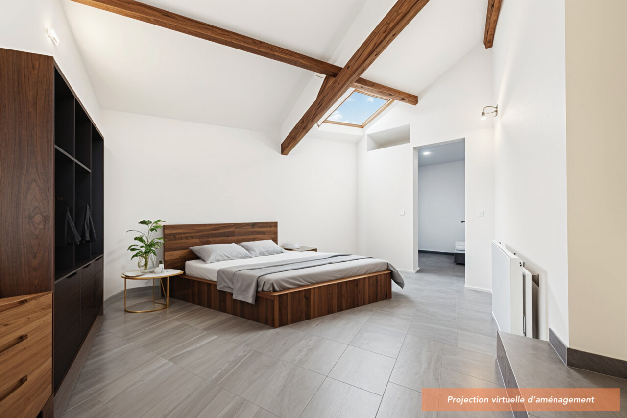 A l'étage se trouve une grande pièce bureau/dressing, une grande chambre de 17m² et une salle de douches (avec grande douche à l'italienne, WC) de 12m² comprenant également un espace buanderie.